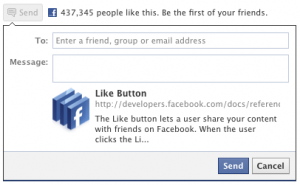 Le bouton Send permet d’envoyer à des visiteurs du site web le lien à des amis Facebook ou groupes d’amis Facebook, ainsi qu’à des adresses e-mail spécifique. Quand le lien est envoyé à des amis Facebook ou les groupes, un message est envoyé dans leur compte facebook. Quand le lien est envoyé à une adresse e-mail, Facebook identifie si cette adresse mail est associée à un compte Facebook et si elle est, un message est envoyé sur le compte Facebook. Si elle n’est pas, un email est envoyé à l’adresse spécifiée par le message et le lien.